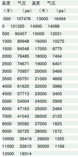 海(hǎi)拔高(gāo)度與大氣壓力對照表
