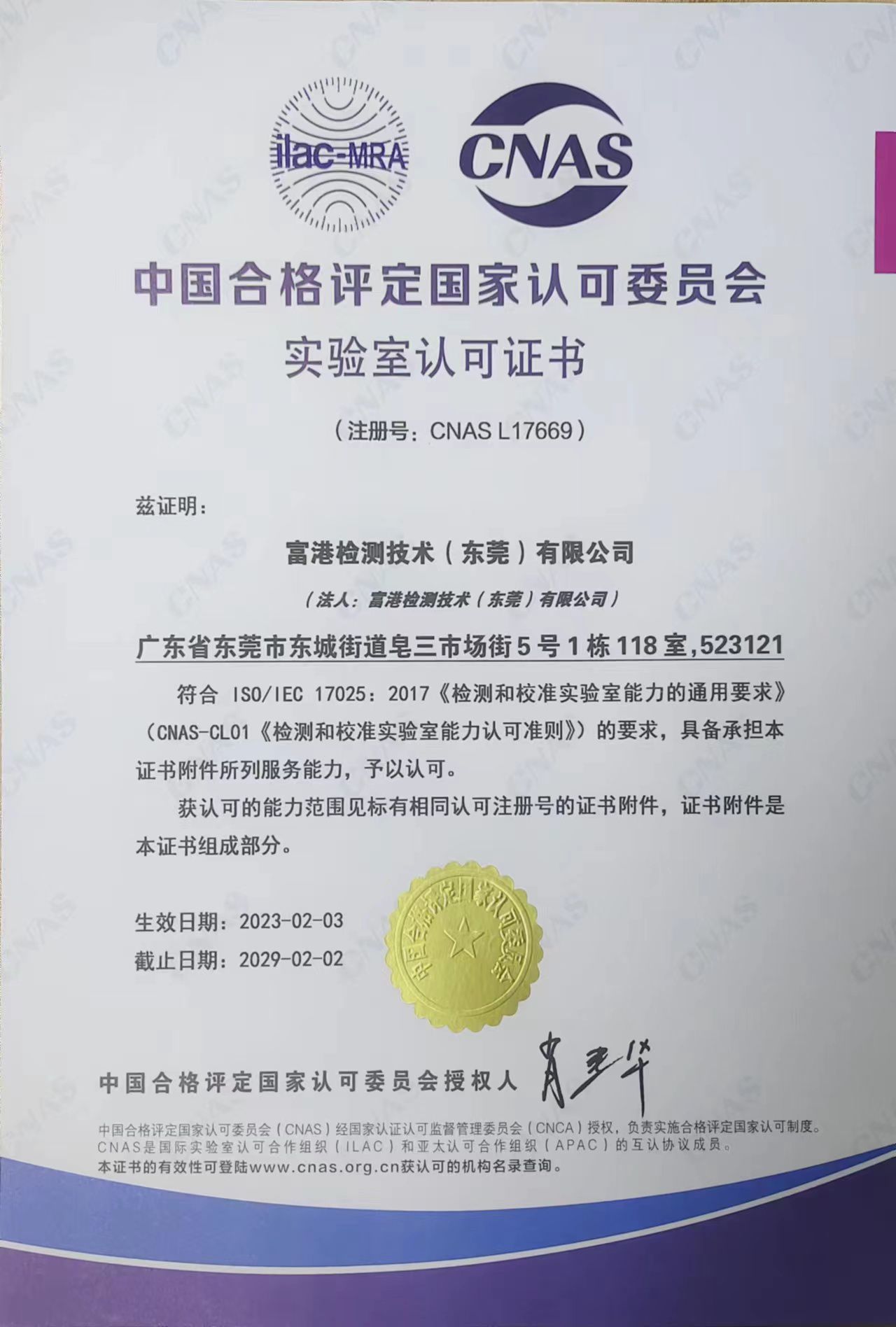 富(fù)港檢測東莞實驗室取得CNAS認可;